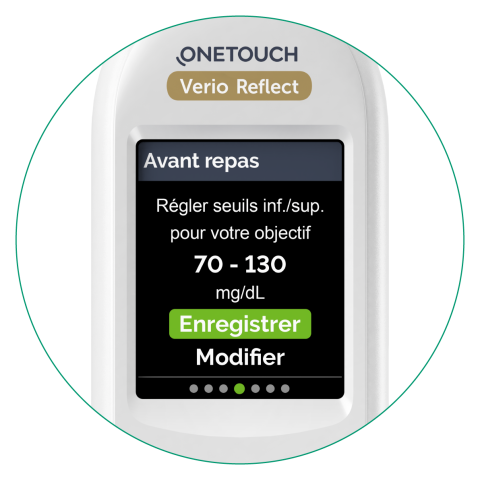 Votre lecteur de glycémie est préconfiguré avec des seuils d’objectifs avant repas et après repas pour vous indiquer quand une mesure de glycémie se situe à l'intérieur, en dessous ou au-dessus des seuils d’objectifs avant et après repas. Ces seuils d’objectifs sont prédéfinis, mais vous pouvez les ajuster selon les recommandations de votre médecin pour qu'ils soient personnalisés selon vos besoins. Il est important de confirmer ou de modifier les paramètres préconfigurés du dispositif selon les objectifs fixés par le médecin afin de définir l’affichage du code couleur (ColourSure® Plus). Appuyez sur Modifier pour mettre à jour vos seuils d’objectifs ou sur OK pour confirmer.